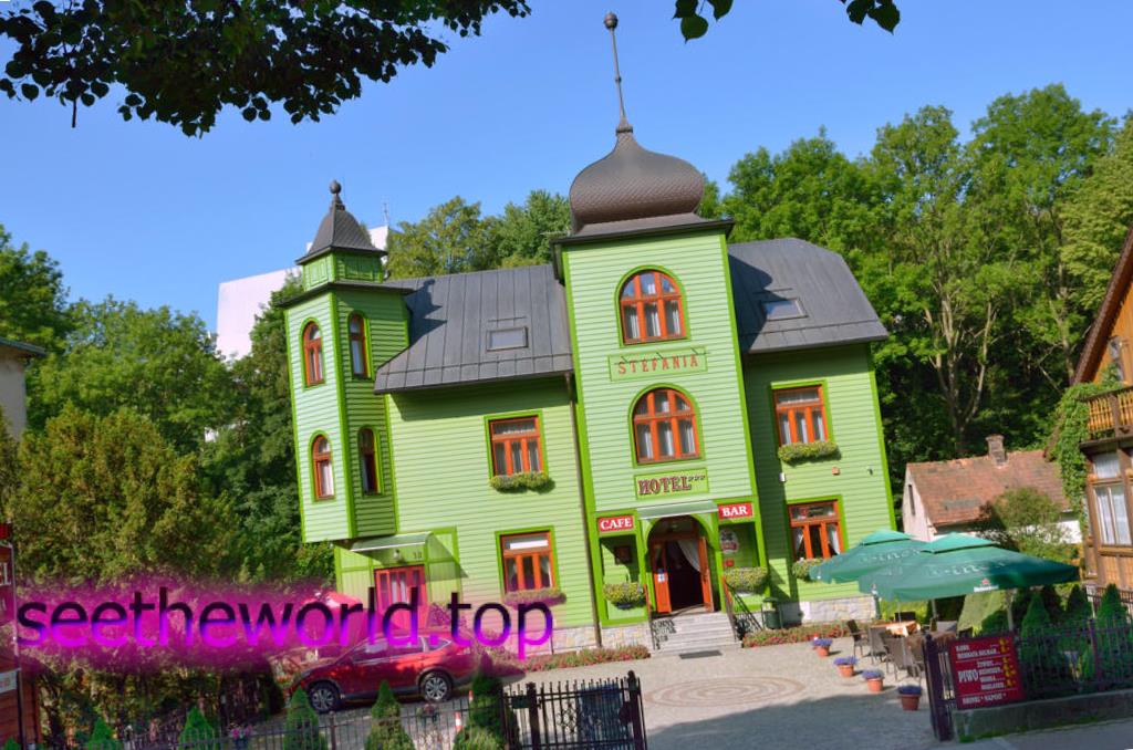 Готель Stefania з зеленим фасадом розташований в центрі міста Криниця-Здруй. У числі зручностей безкоштовні Wi-Fi і приватна парковка.