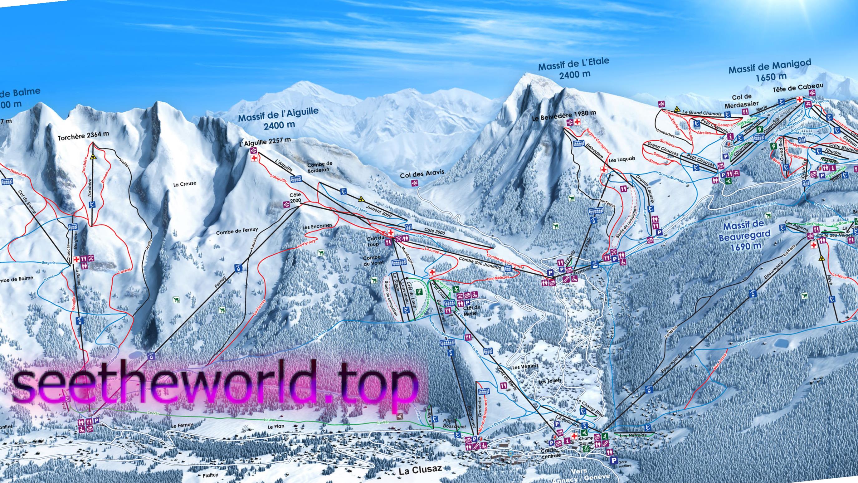 Місця катання відносно різноманітні, траси, в більшості своїй, представляють високі вимоги і до лижникам, і до сноубордистам. Особливо це стосується лісових крутих схилів, що спускаються з масивів Пойнт де Веррез (2616 м), Дель Агуілль (2400 м), Дель Етал (2400 м). Траси тут, в основному, червоні і чорні, найбільш вражаюча – Ля Нойрек масиву Богард. Там, де спуску не рясніють буграми (що типово для Ля Клюза), кататися по ним – справжня насолода!